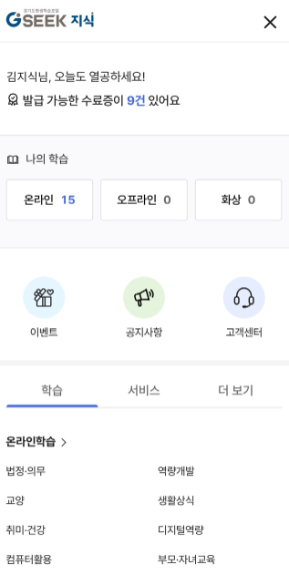 | 학습이력 조회 | 과거에 수강했던 모든 강좌 이력을 연도별로 정리해서 확인할 수 있습니다. |