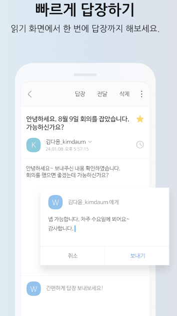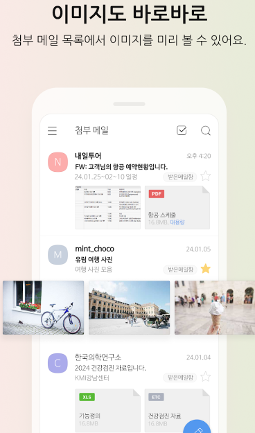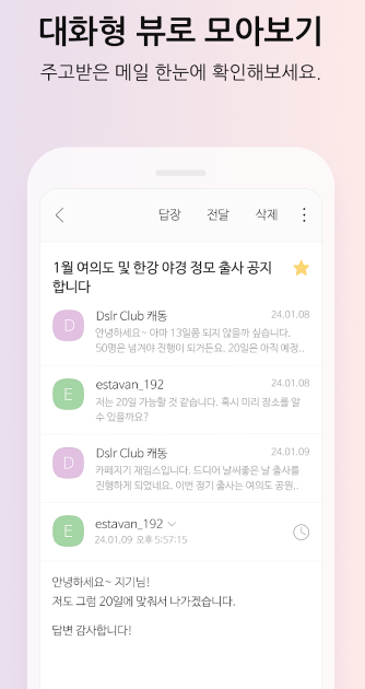 앱 하나로 모든 메일 관리 끝! Daum 메일 뿐 아니라 네이버, 구글 메일까지 연결해 쓸 수 있습니다! 지금 바로 설치해 보세요.