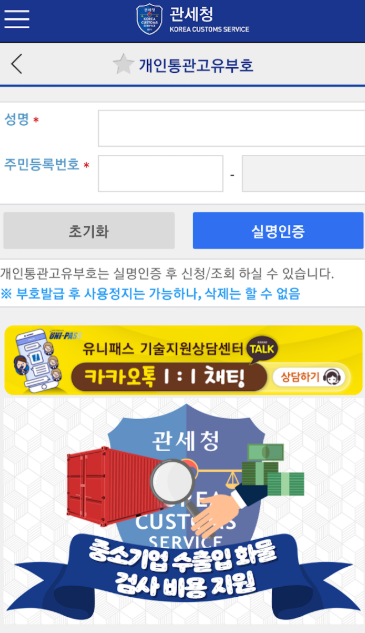 - 유니패스에서 간단한 본인인증 후 바로 조회 가능