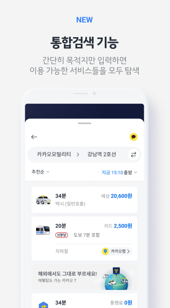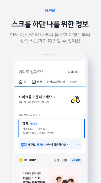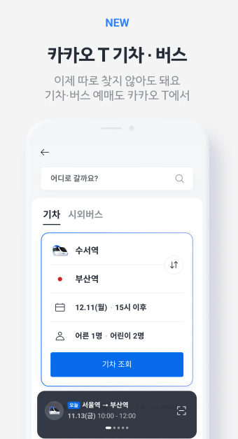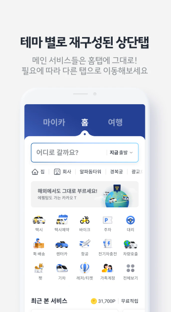 카카오 T의 혁신을 통해 모든 이동의 고민으로부터 벗어나 더 편하고, 즐겁고, 가치 있는 일상을 만들어갑니다. 테마 별로 재구성된 홈 상단탭에서 원하는 서비스를 찾아 이용해보세요. 홈